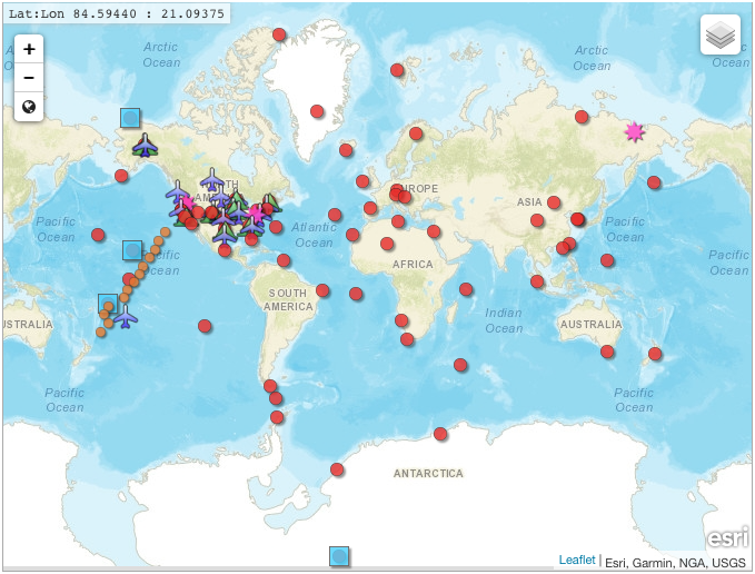 NOAAn verkosto ilmakehän hiilidioksidin mittauspaikkoja. Lentokoneiden kuvat tarkoittavat lähinnä Pohjois-Amerikassa tapahtuvaa näytteiden ottoa pienillä lentokoneilla.