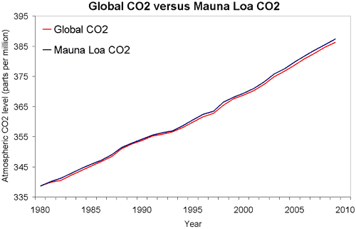 Mauna Loaa käytetään usein esimerkkinä hiilidioksidimäärien vertailussa, koska siellä on tehty pisimpään jatkuvaa mittausta ilmakehän CO2-pitoisuudesta. Tämä on hyväksyttävää, koska hiilidioksidi sekoittuu koko ilmakehään. Seuraava käyrä kuvaa Mauna Loan mittaustuloksia ja maailmanlaajuisia keskiarvoja.